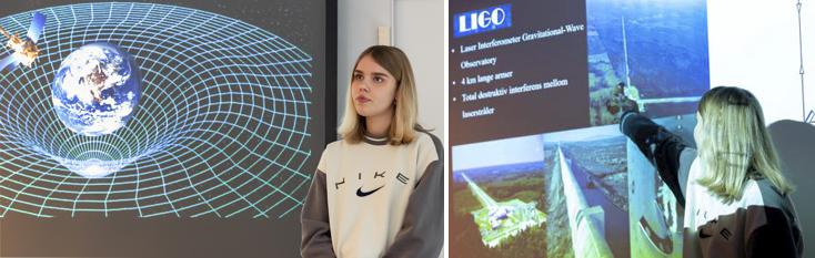 Bildene nedenfor viser presentasjonen til vinneren, Isabella Maria Brun-Lie, om gravitasjonsbølger.