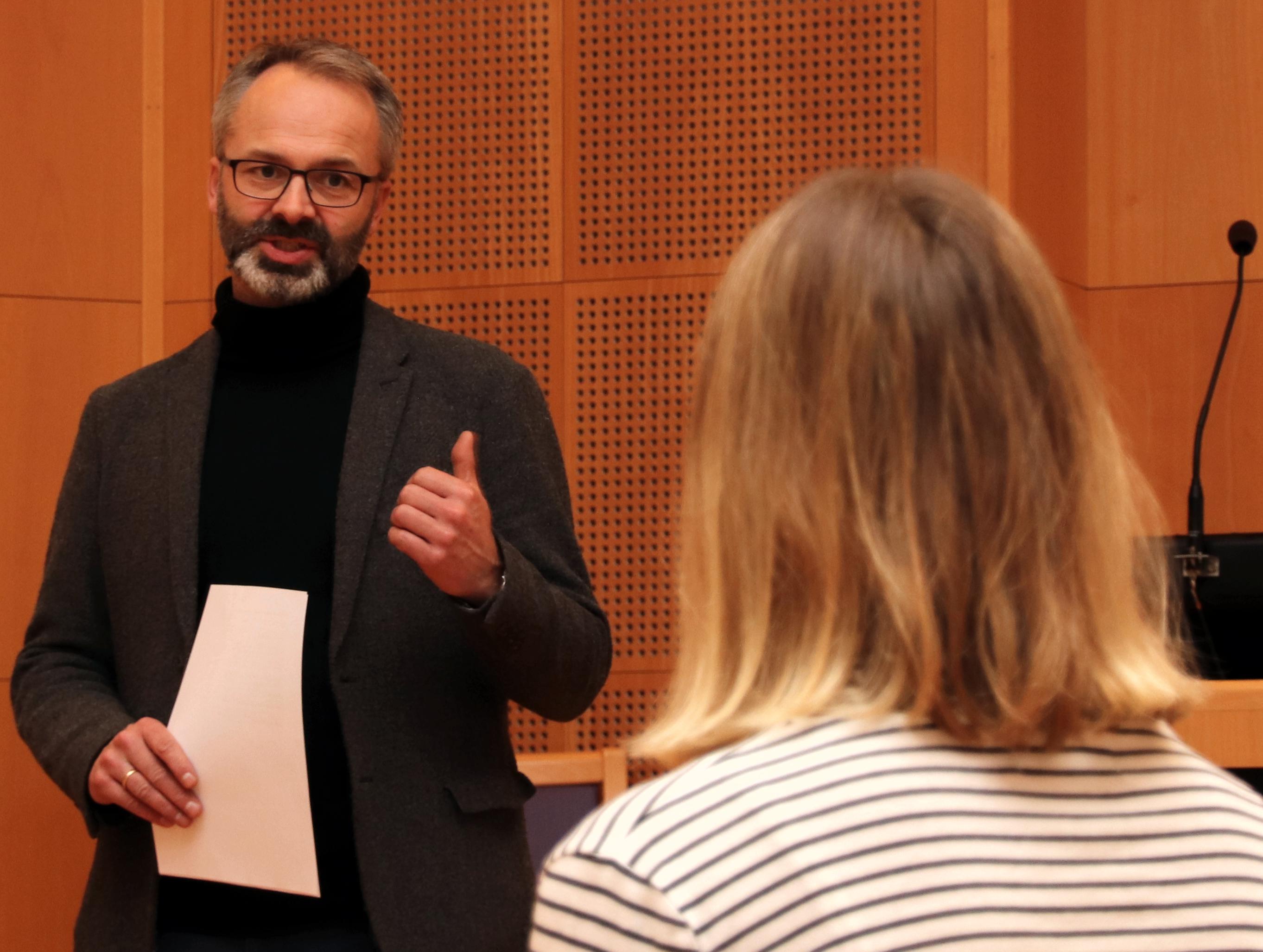 Leder for Rotarys komite for realfagsprisen, Pål Sørensen, redegjør for kriteriene for prisen til vinneren og familie.