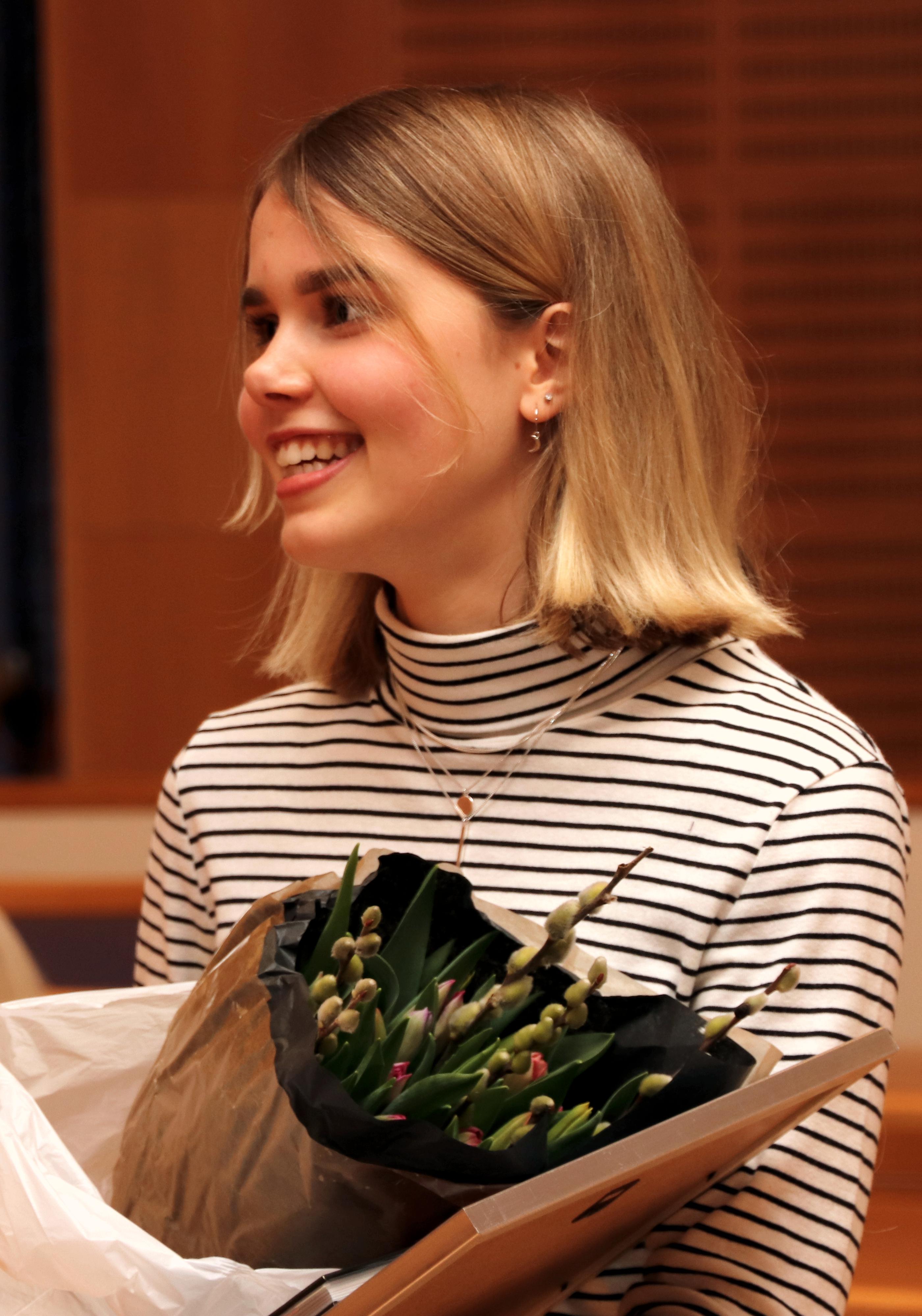 Vinner, Isabelle Maria Bruun-Lie Damhaug med blomster og diplom.